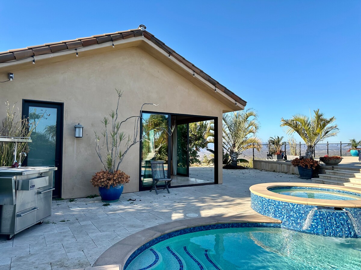 Espace privé serein avec parking séparé, cour, spa et entrée fermée. Profitez d'une vue imprenable sur le sud-ouest et des couchers de soleil depuis votre patio exclusif. La cuisine est complète avec grand réfrigérateur, cuisinière à induction à deux feux, four à convection micro-ondes, cafetière et lave-vaisselle. Lit Queen Size, dressing, buanderie. Deux parcs à chiens entièrement clôturés. Parfaitement situé comme lieu de repos paisible après vos excursions d'une journée à San Diego, Legoland, les plages, les montagnes, les casinos ou les vignobles, tous à moins d'une heure.