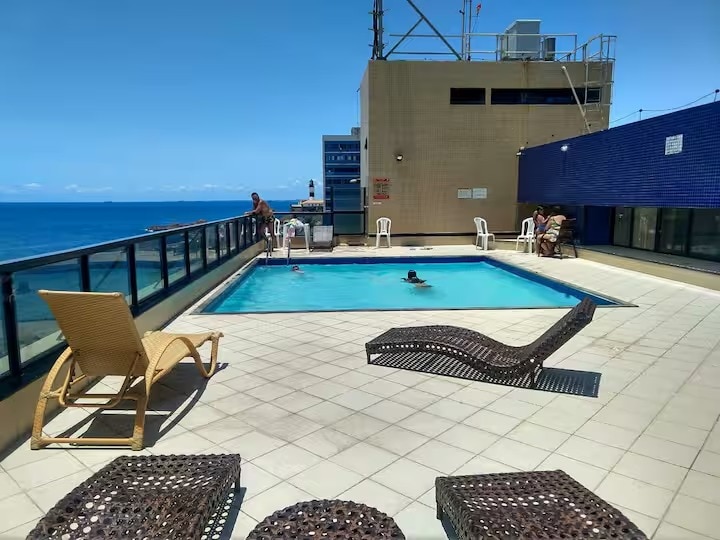 Appartement situé à Bahia Flat, équipé de la climatisation split, d'une télévision intelligente, d'une connexion Wi-Fi de 500 Mo, d'un service de ménage quotidien, d'une piscine, d'un parking et d'une réception ouverte 24h/24 ! Bâtiment en face de la plage (juste en face), situé à 150 mètres de Farol da Barra et à 400 mètres de la célèbre plage de Porto da Barra.