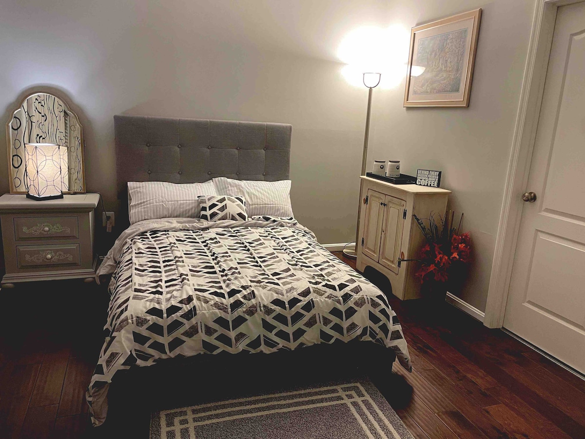Détendez-vous et relaxez dans ce logement calme et élégant, qui dispose de planchers de bois franc et d'une salle de bain privée, ainsi que d'un accès au WIFI gratuit.