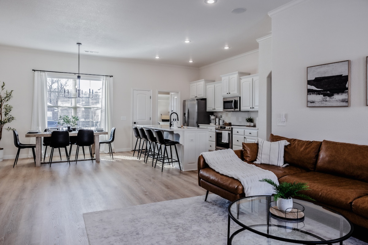 🚗 À quelques minutes en voiture de l'Université de l'Alabama et du Razorback Stadium; à proximité des restaurants et des attractions de Dickson St. 🌞 Solarium avec divan-lit et lit gigogne, salon confortable avec foyer au bois et porche couvert avec foyer extérieur. Cuisine et salle à manger🍳 bien équipées; deux chambres avec bureaux, draps de luxe et téléviseurs intelligents. 🐶 Animaux acceptés (deux chiens, des frais s'appliquent); petite cour et stationnement supplémentaire de l'autre côté de la rue. 📶 Wifi, laveuse et sécheuse, abri pour voiture et entrée.