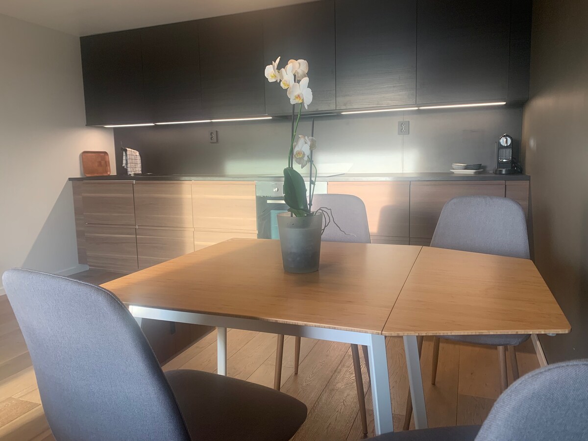 Cuisine et salon avec canapé-lit de 155 cm et vue sur la mer. Grande chambre avec lit double de 160 cm. Cuisine avec four/plaque à induction, réfrigérateur/congélateur, lave-vaisselle et micro-ondes. Salle de bain avec douche, lave-linge et sèche-linge. Balcon et grande terrasse avec pelouse. Parking à l'extérieur. 10 minutes à pied de l'eau avec plages, falaises et port de plaisance, forêt à 1 minute derrière la maison. 15 minutes en voiture du centre, 10 minutes des commerces de Nordby. 20 minutes de Koster en bateau. Quartier calme.