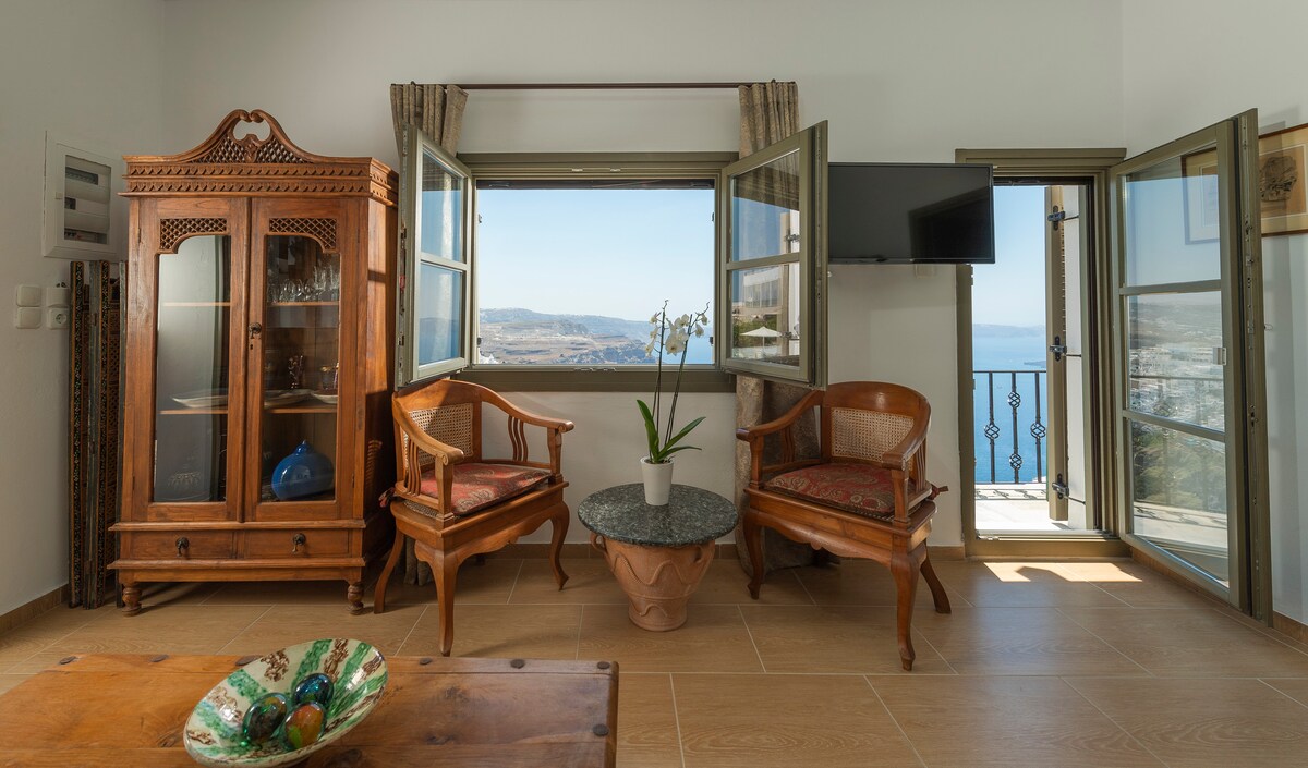 La suite homonyme de la Villa Mirabo construite dans un style maisonnette dispose de deux chambres à coucher différentes avec des lits doubles, ce qui la rend idéale pour les familles, les groupes d'amis et les jeunes mariés qui veulent profiter de leurs vacances de manière très confortable et relaxante. Les deux salles de bains séparées et spacieuses sont joliment décorées et le salon offre des heures de détente. Au deuxième étage, vous pourrez profiter de la vue sur la caldeira et le volcan et du coucher de soleil depuis le balcon privé.