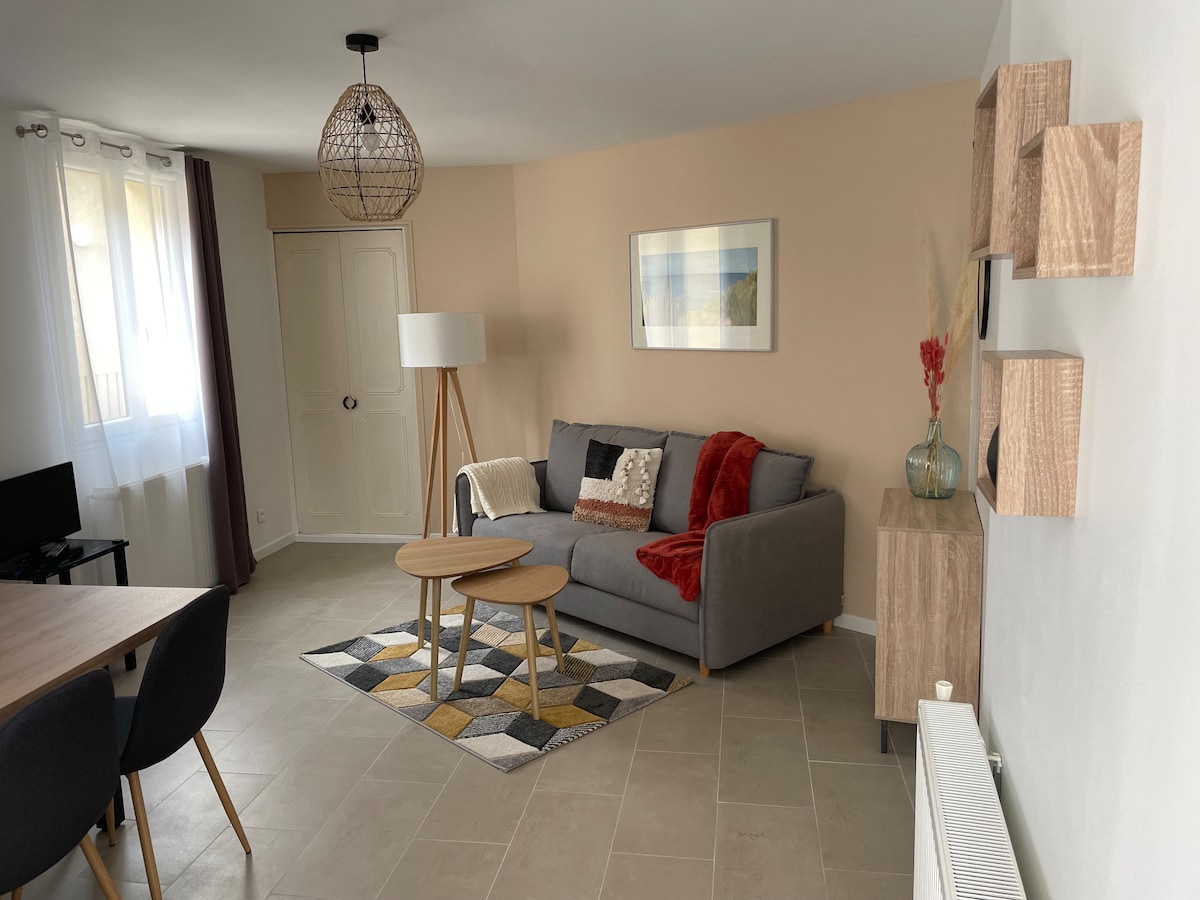 Venez faire une pause dans ce petit logement cosy refait entièrement à neuf situé dans le bâtiment de notre habitation principale . Vous avez une entrée indépendante, avec terrasse privative aménagée pour profiter pleinement du soleil et de la vue dégagée sur la campagne environnante et aussi accéder à notre piscine. L'accès du gîte est facilité par la proximité d'un grand axe routier (RCEA), à 10' de la sortie d'autoroute Chalon Sud et 15' de la gare TGV du Creusot.