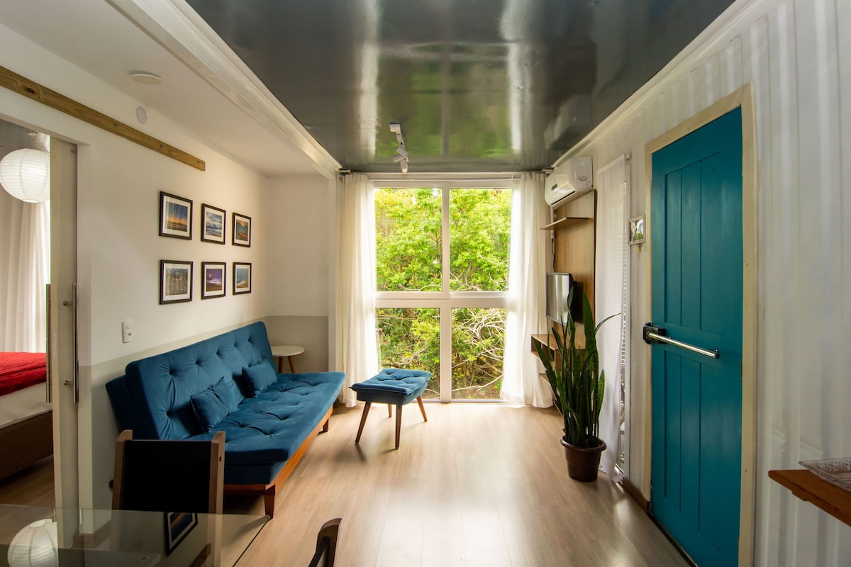 Charmante et aérée maison-conteneur située en face de la forêt indigène et à proximité de la plage des Açores (700 m). Cuisine complète intégrée au salon, terrasse, jardin avec un beau jardin, douche extérieure, barbecue. Internet stable et rapide (250 Mb). À proximité des principales beautés naturelles et des sentiers du sud de l'île: Praia da Lagoinha do Leste (3 km), Lagoa do Peri (6 km), Cachoeira da Solidão (3 km). Le quartier est familial et calme, avec un marché, une supérette, un restaurant, une aire de jeux, un terrain de sport.