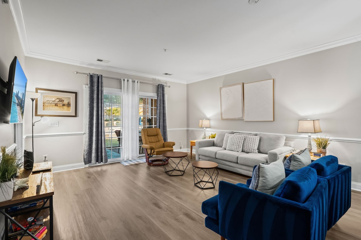 Brillante maison de ville de 4 lits/3,5 salles de bain est de 4 étages de confort, d'amusement et de détente. L'ascenseur permet un accès facile à tous les niveaux. À quelques minutes en voiture de la promenade, de Broadway sur la plage et de Barefoot Landing. Plusieurs terrains de golf situés à 10-30 minutes. Une excellente destination tout au long de l'année ! ⭐️Rendez-vous sur le sable et surfez ! ⭐️Ascenseur privé ⭐️Balcon privé Parking dans le ⭐️garage. Téléviseurs ⭐️Roku dans chaque pièce ⭐️Une baignoire ⭐️Cuisine entièrement équipée ⭐️Vidéo Commençons par les équipements de ⭐️base ⭐️Nettoyé professionnellement