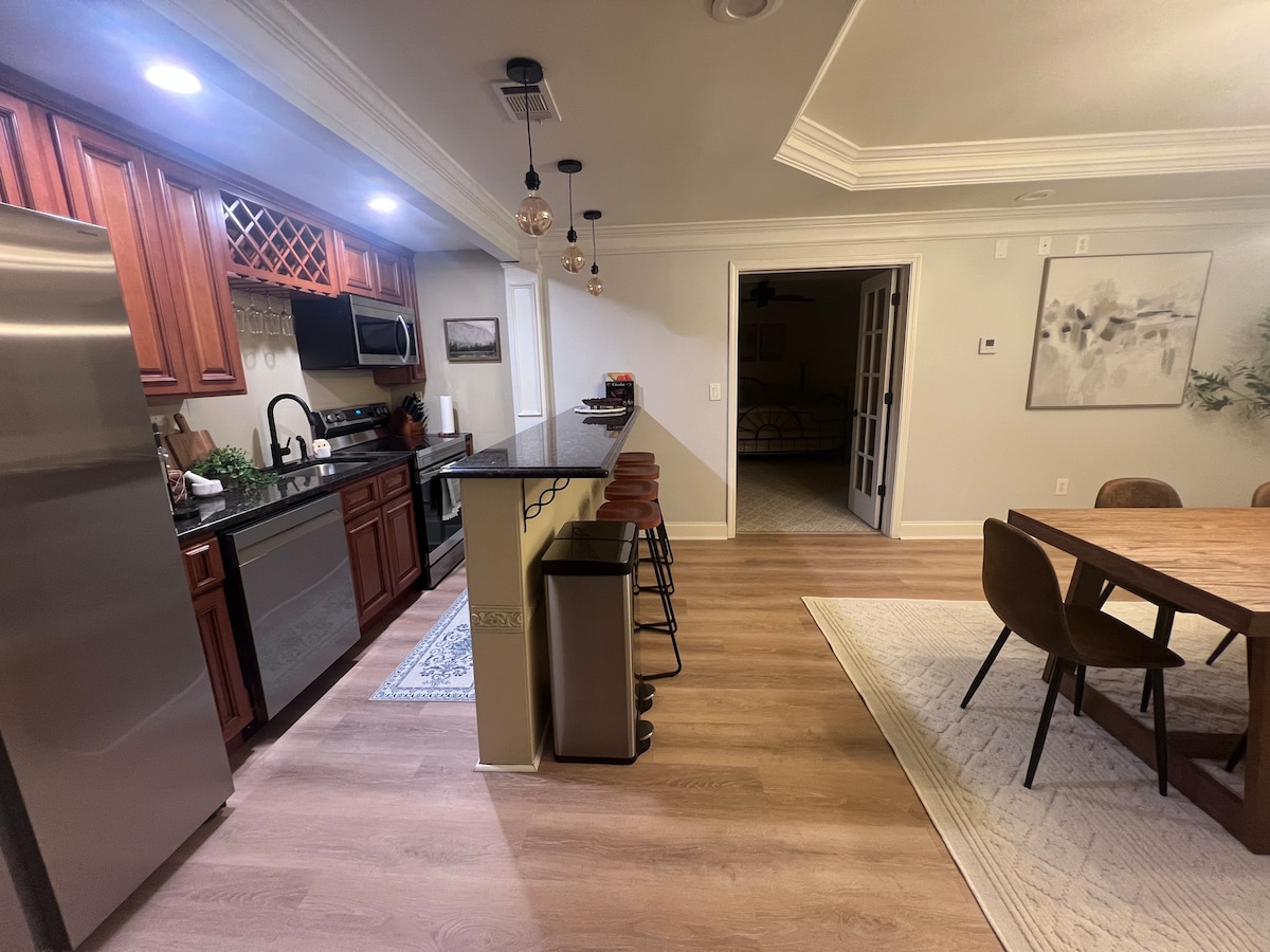Appartement au sous-sol récemment achevé. Cuisine entièrement équipée, accès à la buanderie, entrée privée, parking, Wi-Fi, DirectTV, applications de télévision connectée avec Netflix. Excellent emplacement pour les voyages d'affaires, courts et prolongés. Attractions à proximité : 1. Lac Lanier 2. Mall of Georgia 3. Château Elan 4. Margaritaville, lac Lanier 5. Marinas 6. Restaurants et divertissements 7. Manoir Bona Allen 8. Vignoble Cloudland Accès facile depuis l'I-85 ou l'I-985, transport express depuis le centre-ville d'Atlanta