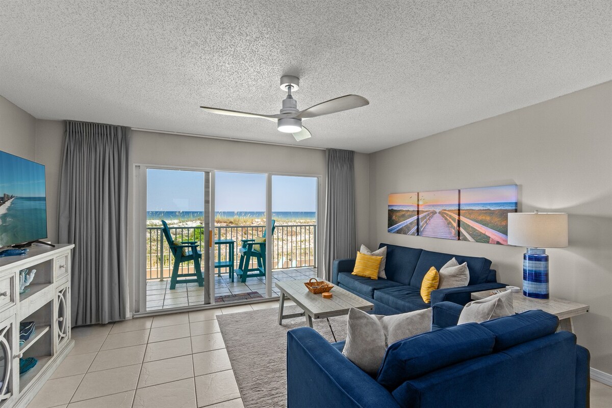 Notre condo de plage non-fumeur au dernier étage offre une vue imprenable sur l'eau depuis toutes les fenêtres. Une cuisine entièrement équipée, une grande table de salle à manger avec six chaises, un salon confortable, des meubles de chambre et des téléviseurs intelligents feront de votre visite un plaisir. Profitez des vues et des sons depuis notre balcon et le soleil de l'après-midi après une journée à la plage. Les chaises et l'équipement de plage sont dans notre placard de balcon pour votre usage. Deux ascenseurs sont disponibles dans notre immeuble et une laveuse et une sécheuse à chaque étage. Bon séjour!