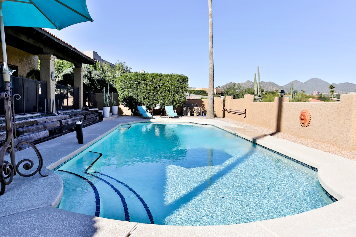 Bienvenue à The Perch, votre escapade élégante et familiale avec vue sur Red Rock et Four Peaks. Profitez d'une piscine privée, d'une salle de jeux, d'un espace de travail dédié et d'une décoration soignée. À quelques minutes de Fountain Park, de la randonnée, du golf, du tubing et du lac Saguaro. Parfait pour les couples, les familles ou les télétravailleurs. Wifi rapide, stationnement couvert et ciels au coucher du soleil inclus. Réservez votre retraite dans le désert dès aujourd'hui! Veuillez noter que la piscine n'est pas chauffée.