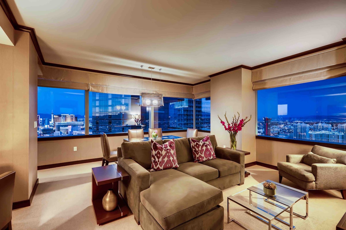 VUE EMBLÉMATIQUE SUR LE STRIP DE LAS VEGAS Une suite au-dessus de tout le reste ! Plongez dans la vue imprenable sur le Las Vegas Strip et les majestueuses montagnes du Nevada. Le spacieux penthouse panoramique 1 chambre/2 salles de bain est situé dans le prestigieux Vdara Hotel and Spa. Très bien noté pour son emplacement idéal et son atmosphère sophistiquée, fraîche et sans fumée. Comprend des passerelles intérieures reliant le Bellagio et le Cosmopolitan ! ⭐️ PAS DE FRAIS DE CENTRE DE VILLÉGIATURE ⭐️ STATIONNEMENT GRATUIT ⭐️ PISCINES DU COMPLEXE HÔTELIER Voir sur YouTube VegasJewels Vdara SkySuite (Suite de luxe)