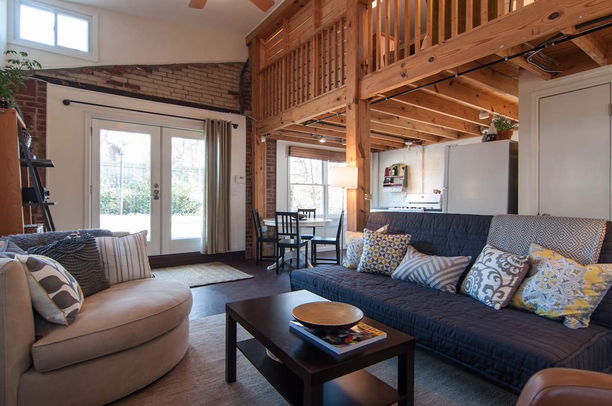 Un espace de luxe artisanal lumineux et ouvert pour les voyageurs. Conçu sur mesure et doté d'une cuisine complète, d'une chambre en mezzanine, d'un espace de travail, d'un foyer, de papier peint sur mesure et d'œuvres d'artistes locaux. La lumière naturelle qui traverse les grandes fenêtres et les puits de lumière fait du Gwyneth l'endroit idéal pour une escapade intime à Nashville avec une amie ou un partenaire, ou pour une retraite solo inspirante. Pour des raisons de sécurité et de propreté, le logement n'est pas considéré comme adapté aux animaux de compagnie ou aux enfants.