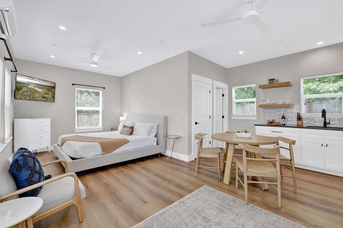 Magnifique Casita de style studio récemment construite. Profitez de la paix et de la tranquillité du Texas Hill Country tout en étant à quelques kilomètres du centre-ville de Fredericksburg. La Casita est équipée d'une connexion Wi-Fi et d'une télévision intelligente. Nous fournissons également un bar à café aménagé pour votre plaisir ainsi qu'un espace extérieur avec un foyer et des sièges. Il y a des barbecues sur la propriété, alors apportez des steaks à griller et votre bouteille de vin préférée pour dîner sous les étoiles! À très bientôt
