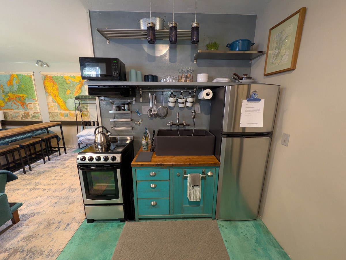 Notre chalet sud est niché en plein cœur de Springdale avec une vue imprenable sur le parc national de Zion ! Un endroit idéal pour 2-3 personnes - un bel espace ouvert abrite un lit King Size californien et un canapé-lit simple, une salle de bain complète et une kitchenette. Un endroit idéal pour se détendre après une journée d'aventure ! Profitez de toutes les vues spectaculaires depuis la cour juste à l'extérieur de votre porte arrière ou la terrasse sur le toit juste au-dessus de votre espace. Bonus : vous serez à distance de marche d'à peu près tout à Springdale !