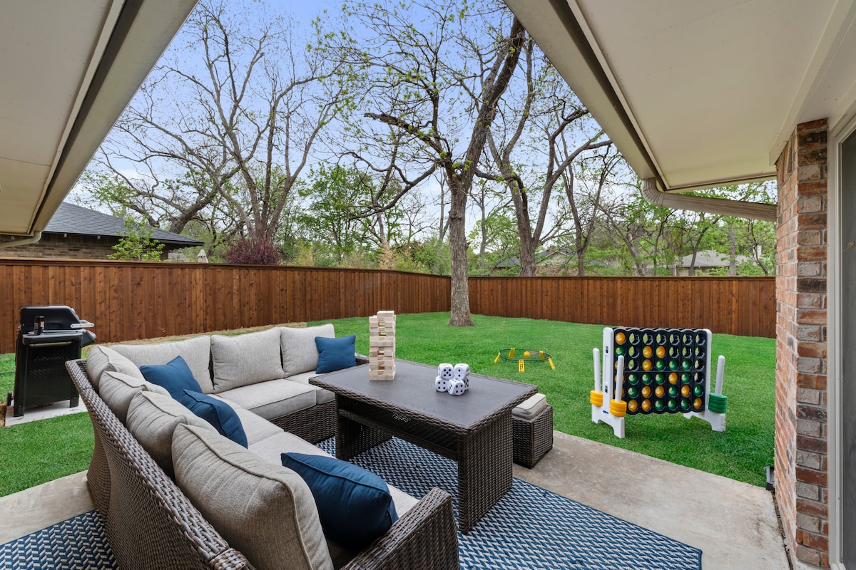 Charming home in the heart of Frisco. Super clean inside & outside with a relaxing heated pool, spa, oversized living room, game room, outdoor patio & firepit for you to experience lovely Texas living! Patio furniture, lounge chairs & a BBQ grill are available in the backyard. We have lots of pool toys, board games, Pool table & toys for the whole family to enjoy. The home is connected with high speed internet & TV. No checkout chores ,enjoy your stay, not spend your last morning cleaning.