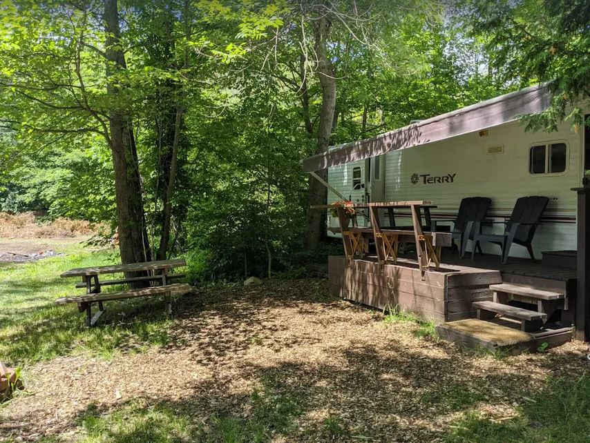 Remorque moderne et propre avec vue sur l'eau dans un petit terrain de camping familial. Entièrement équipé avec électricité et eau. Bien que les toilettes aient été désactivées dans la remorque, les toilettes modernes sont à quelques pas et comprennent des toilettes à chasse d'eau, des urinoirs, des éviers, des miroirs et des douches chaudes. Pour cuisiner, vous pouvez utiliser le poêle à bois, le four, le foyer extérieur ou le barbecue à gaz. Nous fournissons les casseroles et les ustensiles. APPORTEZ : oreillers, draps, couvertures, serviettes, torchons de cuisine/torchons, huile de cuisson, épices, nourriture.