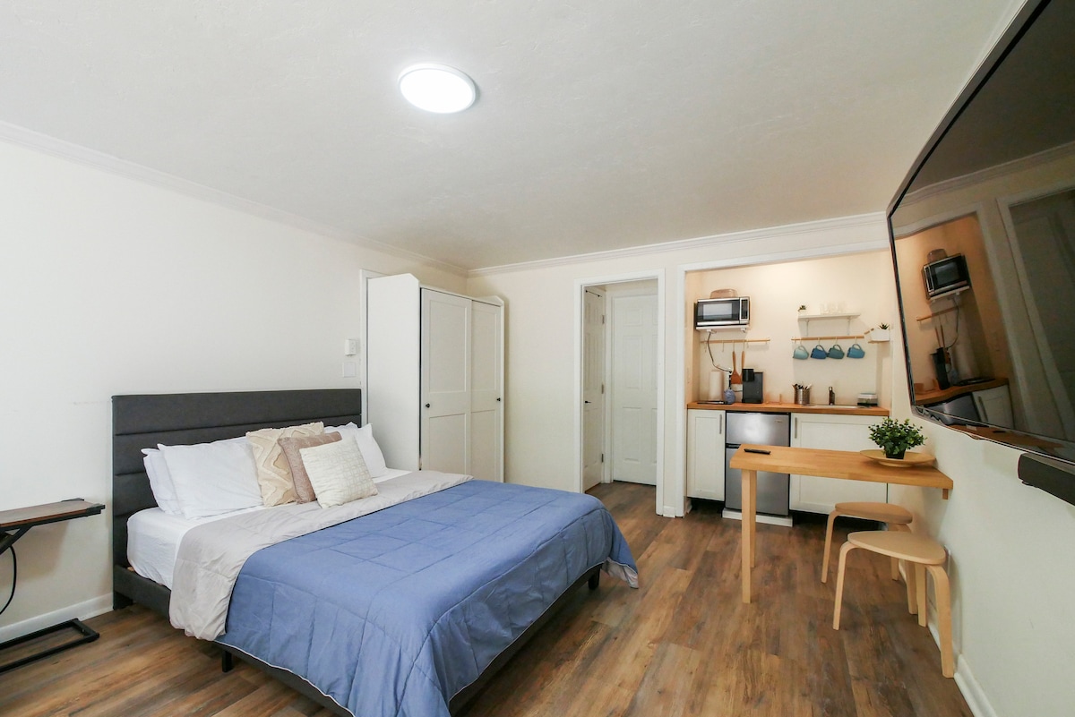 Bienvenue dans notre suite Enchanted Forest! Profitez de ce studio serein avec beaucoup de lumière naturelle et vert tout autour. Situé au cœur de Gainesville. Que vous soyez un professionnel de la santé, que vous visitiez les sources, que vous assistez à un match à l'UF ou que vous vous rendiez dans les grands hôpitaux de la ville, cet emplacement est parfait pour vous. Situé près de l'I-75, à 5 minutes du centre commercial Oaks, à 10 minutes du Ben Hill Griffin Stadium, du campus de l'Université de Floride et de l'hôpital UF Health Shands.