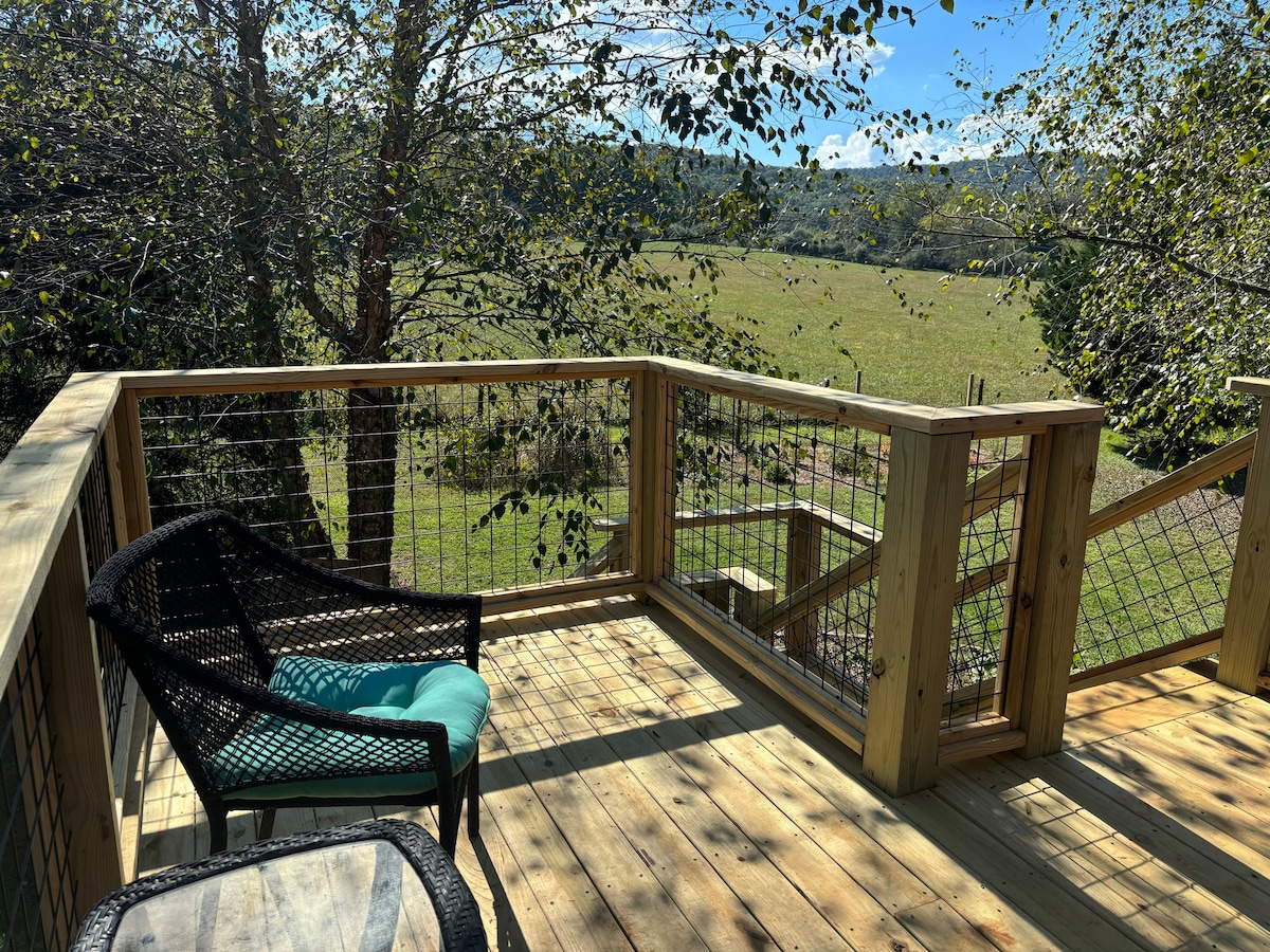 Unité d'hébergement de luxe avec vue sur la montagne. Nous avons DES ALPAGAS, DES PAONS et DES POULETS sur la propriété. Sentier des Appalaches, cascades, sentiers de randonnée, lacs, parcs aux alentours. DOMAINE VITICOLE : Domaine viticole de Frogtown à 14 km. Trois Sœurs vin 14 mi. Domaine viticole Kaya 15 mi. Villes : HELEN 30 mi. Dahlonega 20 mi. Blairsville à 20 km. Blue Ridge 30 mi. Après une journée complète de randonnée, de course à pied ou à cheval, asseyez-vous et profitez d'un massage complet du corps dans une chaise de massage de luxe ou asseyez-vous sur le porche et détendez-vous avec la nature. Licence américaine de location courte durée n ° 013688