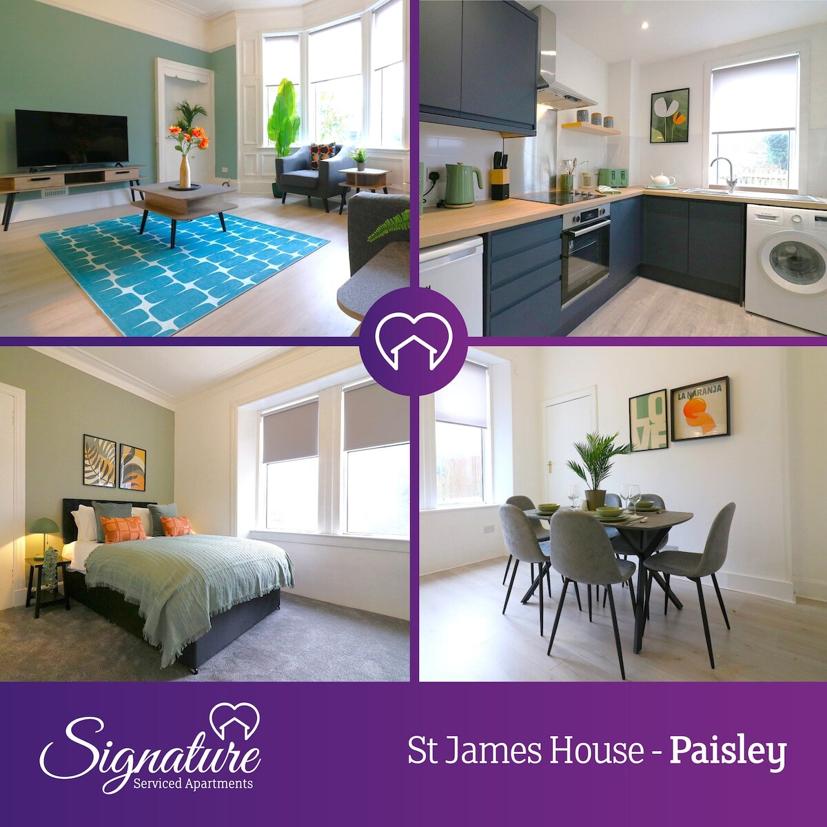 Bienvenue dans notre collection d'appartements de 2 chambres de haute qualité situés dans le centre de Paisley. Immeuble victorien récemment rénové avec des chambres spacieuses et lumineuses pour se détendre. Commodités locales à proximité. WIFI, télévision connectée, entrée de porte sécurisée. Emplacement central avec d'excellentes liaisons de transport À 2 minutes à pied de la gare routière et ferroviaire pour un accès facile à l'aéroport GLW, au centre-ville de Glasgow et au Renfrewshire. 10 min en train jusqu'à Glasgow Central. À 5 min à pied de Paisley Uni et du West College Scotland