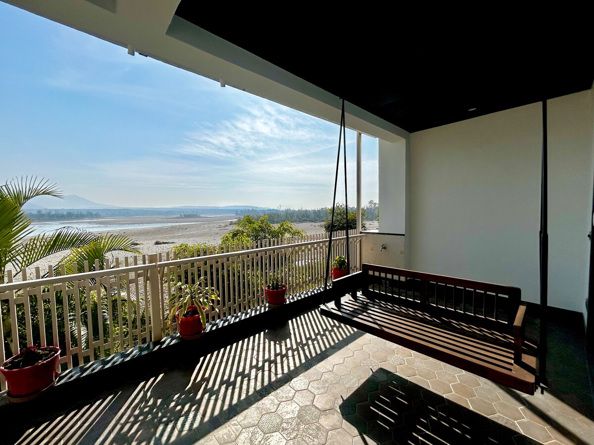 Bienvenue dans la villa de luxe exclusive Anjaney, située sur les rives du Gange. Vous obtenez 4 chambres luxueuses avec salles de bains attenantes, chaque chambre a un grand balcon avec une vue fascinante. La villa dispose également d'une cuisine entièrement équipée, d'un salon bien conçu, d'un coin repas extérieur avec barbecue, d'un ascenseur intérieur pour accéder à tous les étages, vous aurez également 2 places de stationnement à l'intérieur de la villa. Vous avez une vue complète et dégagée sur le fleuve sacré Gange et les collines verdoyantes du parc national de Rajaji.