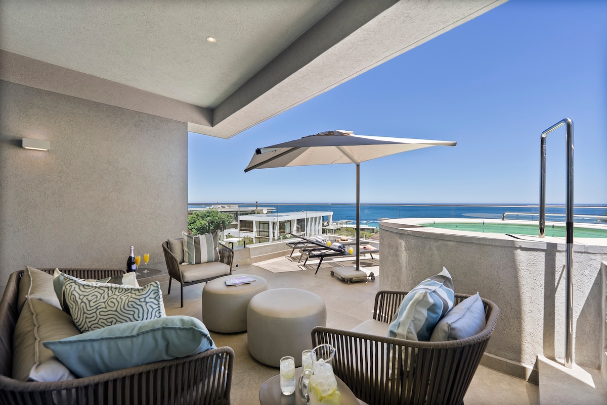À quelques pas de la plage de Camps Bay! Réveillez-vous avec une vue incroyable sur la mer et sur la montagne de la Table, la montagne de la Tête de Lion et les Douze Apôtres. Passez l'après-midi à vous prélasser au bord de la piscine, à faire un barbecue ou à déguster une pizza tout juste sortie du four à pizza pendant que le soleil se couche sur l'océan. À l'intérieur, il y a deux chambres spacieuses et des finitions élégantes. Les espaces de vie ouverts s'ouvrent sur le balcon panoramique et la terrasse de divertissement. Un équilibre parfait entre luxe et détente avec un sauna privé.