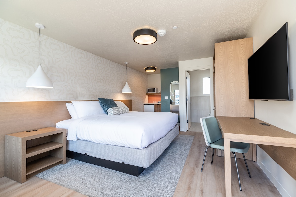 Designed for comfort and convenience, our King Room offers a spacious retreat with a plush king-size bed and a well-equipped kitchenette. Whether you're staying a night or a week, enjoy the added amenities of a refrigerator, microwave, stovetop, and basic cookware — perfect for travelers who like the option to dine in. Simple, stylish, and thoughtfully updated, this room is ideal for couples or solo adventurers looking to unwind after a day of exploring southern Utah.