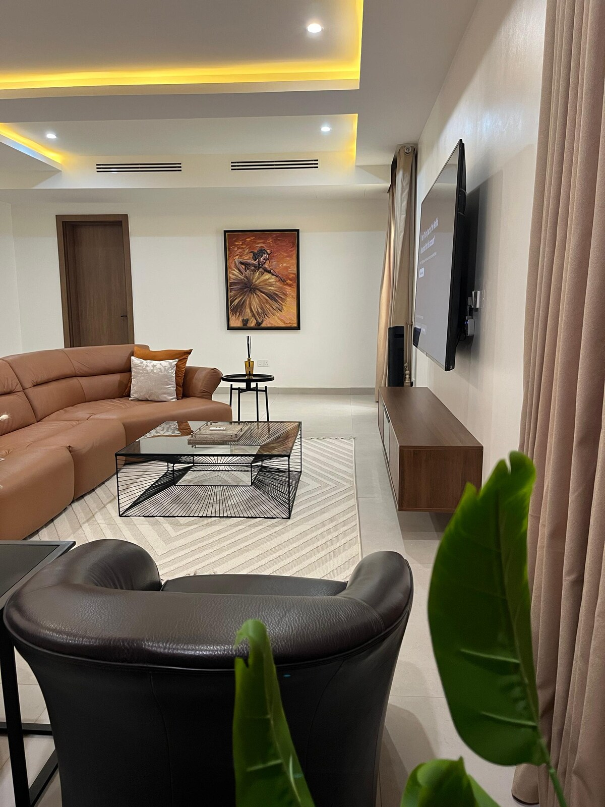 Porte avec code Balcons privés Machine à laver 3 chambres confortables ; 5 climatiseurs Espace de travail Salon meublé Cuisine entièrement équipée 4 toilettes et 3 salles de bain Starlink et Wi-Fi fibre optique Lumière 24h/24 (solaire | Onduleur | Gen) Si pas de réseau électrique : de 6 h à 8 h, de 18 h à 12 h, mais l'onduleur est toujours allumé. Proximité des marchés, des boîtes de nuit, des restaurants et des magasins Draps et serviettes propres et propres Quartier serein, sécurisé et magnifique Télévision connectée 85", 65", 50 ", 50" (Prime, Netflix et Appletv)
