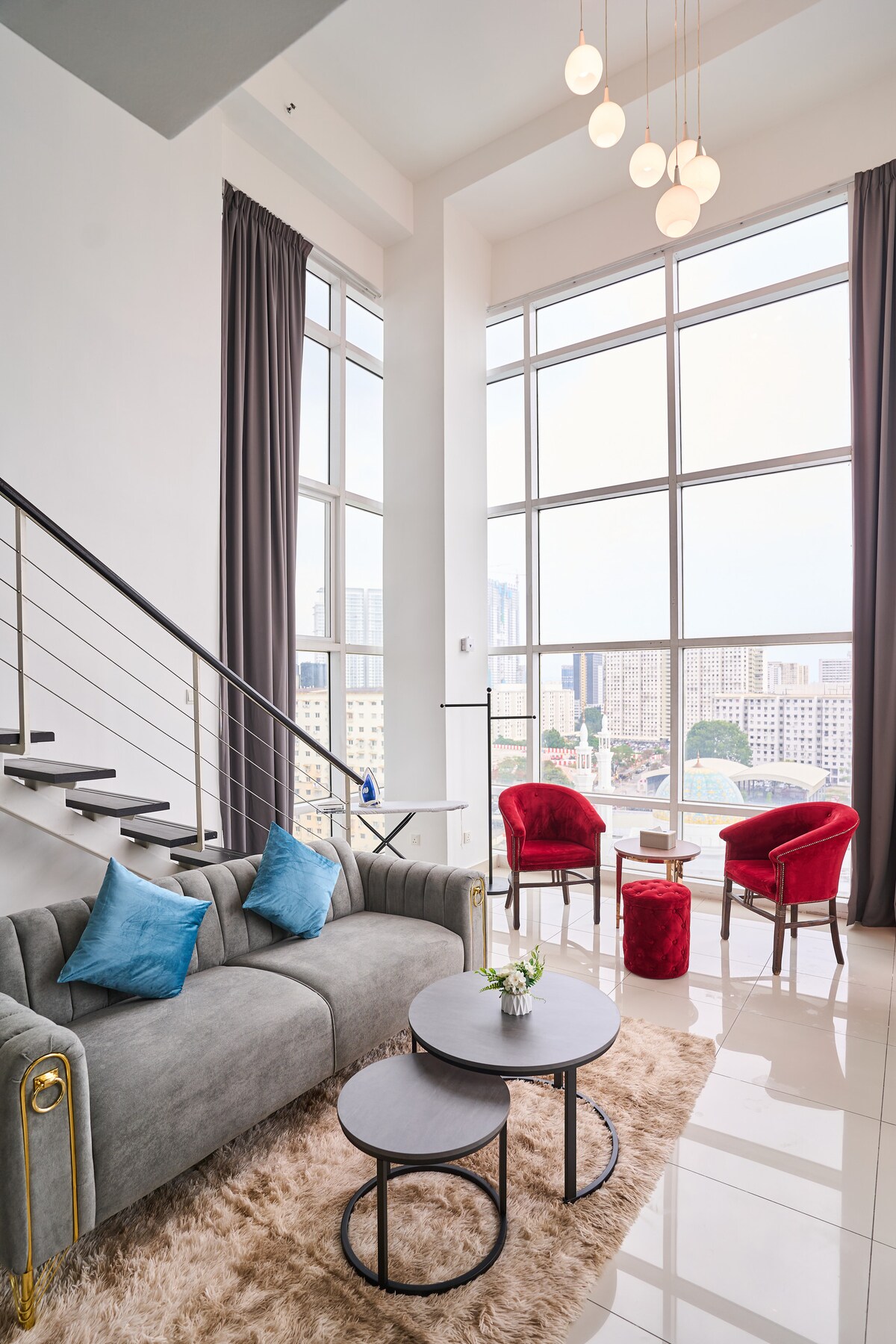 Amenez votre famille et vos amis dans ce duplex moderne avec beaucoup de divertissements. Ce sera un séjour amusant et inoubliable ! Commencez votre journée avec une belle vue sur la mer au lever du soleil et promenez-vous le long de la promenade en bord de mer tout en admirant le coucher du soleil. Un emplacement stratégique : - juste au-dessus d'Automall (restaurants, pubs et épiceries) ; - situé au cœur de Penang, ce qui permet d'explorer facilement le site du patrimoine mondial de l'UNESCO de Georgetown et la ville classée par CNN.
