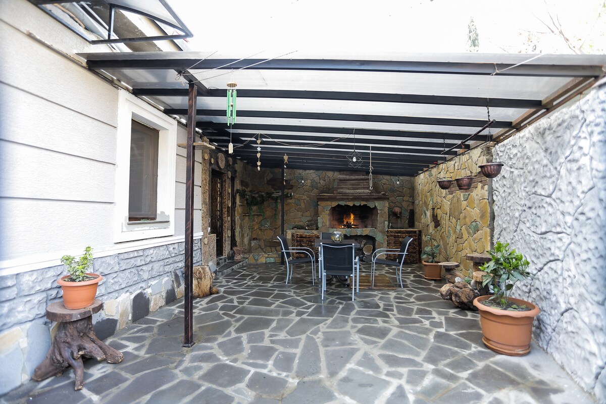 Une nouvelle maison d'hôtes avec un jardin et une véranda,avec une vue magnifique sur Jvari et Svetitshoveli,au centre de l'ancienne capitale de la Géorgie - la ville de Mtskheta, devant la cathédrale de Svetitshoveli. La maison dispose de 3 chambres avec salles de bains privées et toutes les commodités et d'une salle à manger confortable avec une salle de bar où vous pouvez utiliser la cuisine si vous le souhaitez. En plus des trois chambres du jardin, il y a également un nouveau chalet climatisé avec une petite cuisine et une salle de bain. Les hôtes sympathiques parlent russe et anglais.