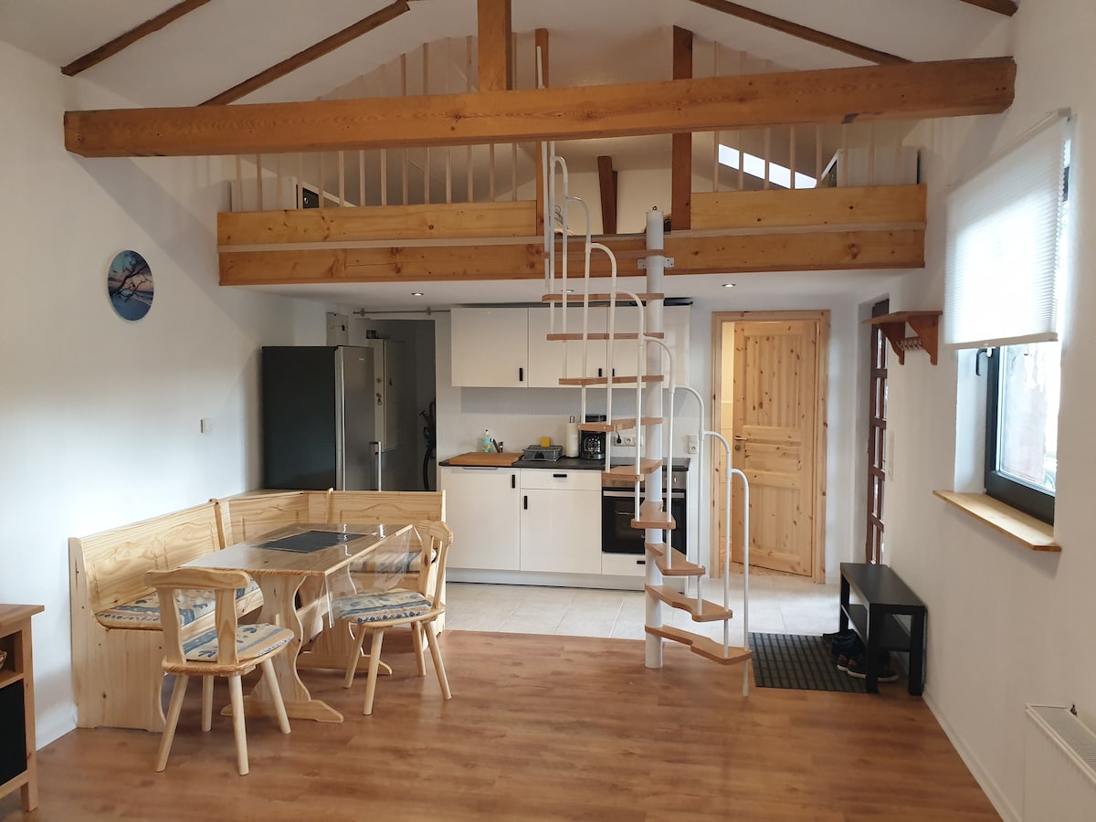 Asseyez-vous et détendez-vous... Notre appartement d'une pièce a été créé uniquement avec des matériaux de construction naturels. Avec une grande attention portée aux détails, j'ai travaillé ici de l'ardoise naturelle et du bois de chêne. L'intérieur de haute qualité invite à la détente. Ici, à la porte du Vogelsberg se trouve, entre autres, l'entrée du sentier de vélo de montagne volcanique « Mühlental ». Station de charge pour vélos directement à l'appartement. Ensuite, une séance de sauna ? Si vous êtes intéressé, il est possible de faire un tour avec mes US Oldies ;-)