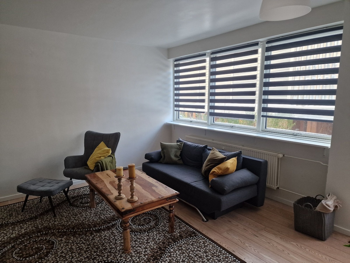 Appartement de 2 pièces agréable, lumineux et confortable dans une villa neuve avec entrée privée dans un quartier résidentiel calme. Parking gratuit à la porte. Accès à votre propre cour privée à l'extérieur de la porte d'entrée. Salle de bain avec douche avec « douche à effet pluie » et douchette. La chambre dispose de 2 lits simples qui peuvent être assemblés pour former un grand lit double. Salon/salle à manger avec cuisine bien équipée avec réfrigérateur/congélateur, micro-ondes et plaque à induction Canapé et table à manger/bureau. Enregistrement facile avec boîte à clés.