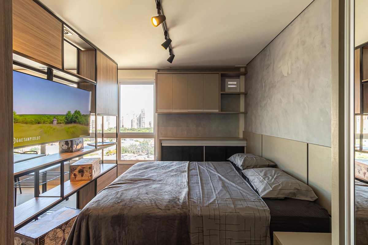💯 Découvrez Marista Premium! Appartement complet avec chambre et salon séparés, deux Smart TV, wifi rapide et tout le confort nécessaire pour profiter de Goiânia avec style.Parfait pour les voyages d'affaires ou de loisirs. Allumez la climatisation et la télévision par commande vocale et écoutez votre musique via Alexa et profitez du centre gastronomique du secteur Marista et du Setor Bueno contemporain dans la meilleure région de Goiânia ! Mélange de condominiums de style intelligent Résidences Creation ®️Renovato
