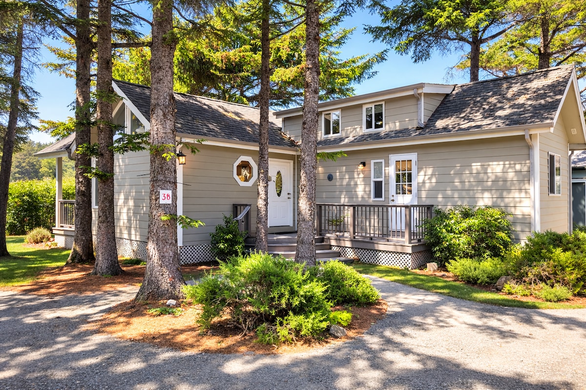 Idéalement situé avec un aménagement bien pensé, il crée un espace pour créer des souvenirs. Bien que petit, 625 pieds carrés, ce chalet est rempli de tout pour faire un séjour incroyable sur la côte. Admirez l'océan depuis le double pont, jouez à des jeux ou dressez une tente sur le gazon propre, accrochez des hamacs aux poutres en cèdre, cuisinez à l'extérieur et mangez sur la terrasse, baignez-vous dans le spa ou détendez-vous avec le wifi par câble. Le soir, c'est Netflix ou regarder les étoiles autour du feu. Nous acceptons les animaux de compagnie, avec des frais de 55 $ par séjour.