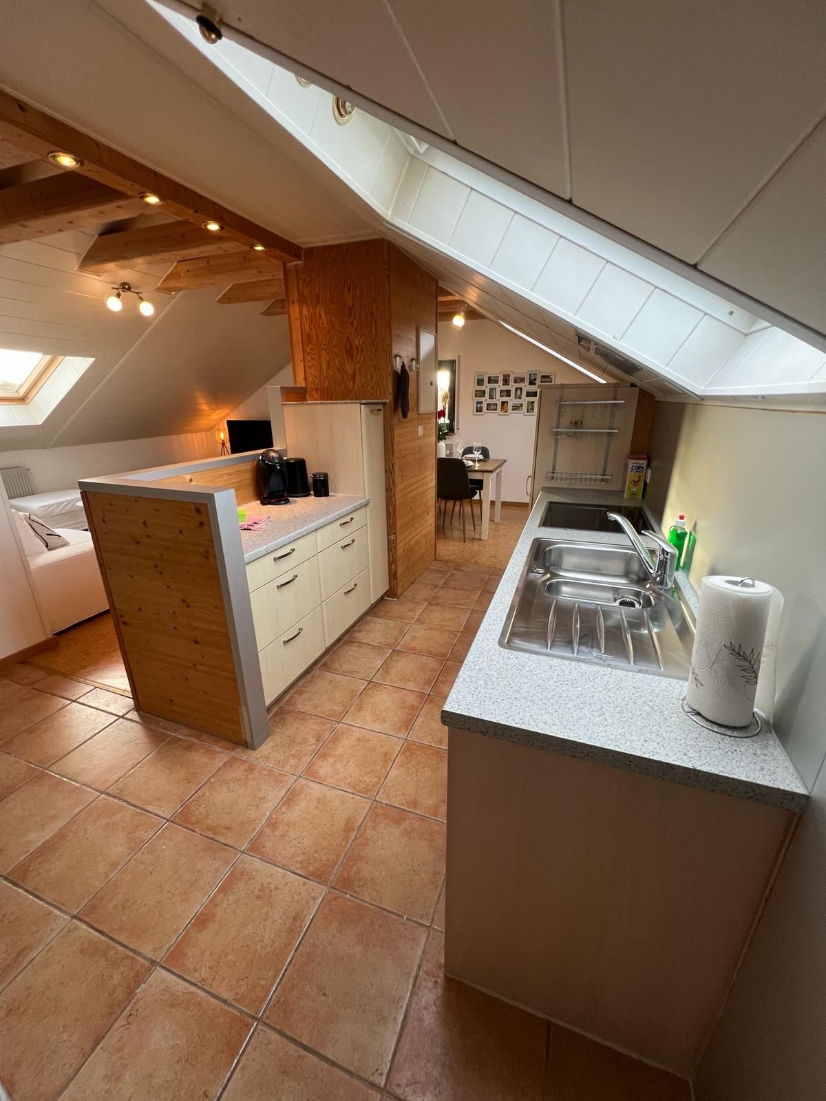 Nous vous proposons un appartement mansardé lumineux dans notre immeuble de trois familles : Il est entièrement rénové et transformé en un studio confortable. L'appartement est adapté pour deux personnes, avec un lit double, ainsi qu'un canapé-lit. Vous pouvez rejoindre le supermarché, le marché couvert et le centre-ville à pied en 10 minutes maximum. Nous avons un arrêt de bus juste devant la porte. Le bus est à 10-15 minutes de la gare centrale. Les vélos peuvent être rangés dans le garage.