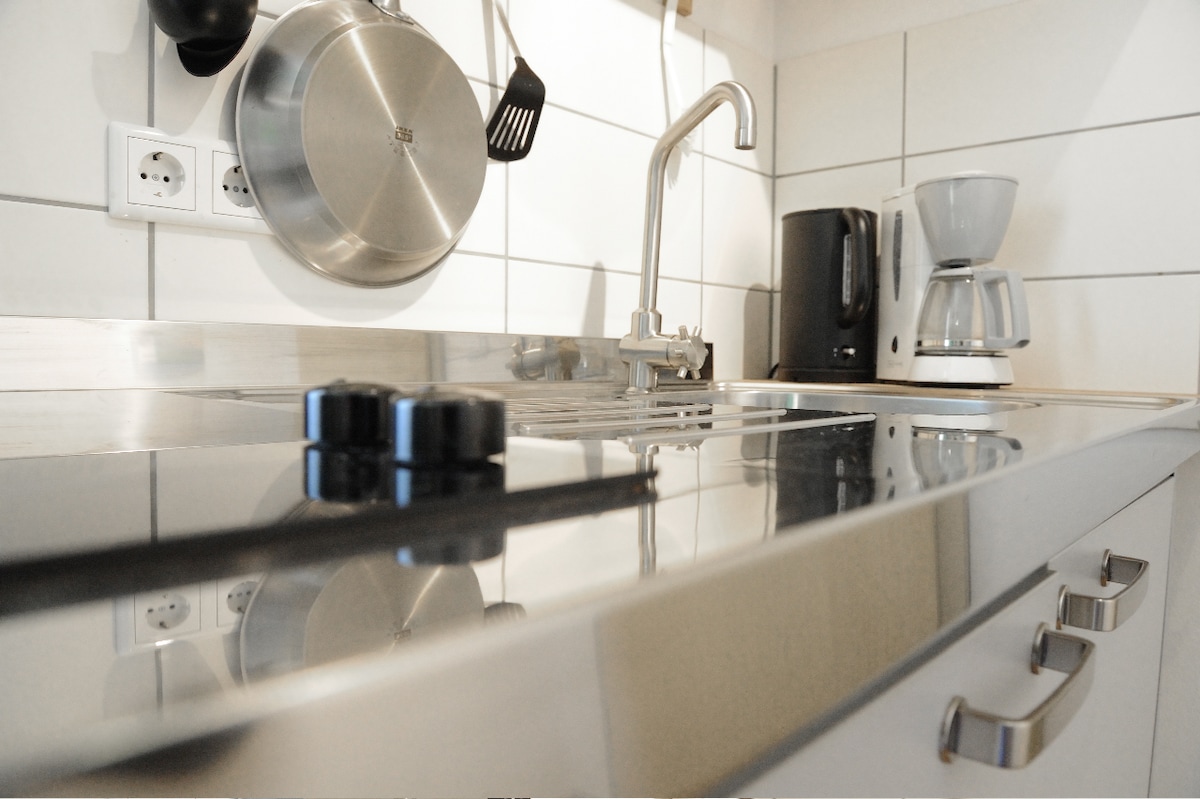 Appartement de 30 m² dans une maison mitoyenne rénovée Zone d'entrée Pièce principale lit de 1,60 m, canapé (avec fonction de couchage de 1,30 m de large), table à manger exécutée comme buffet Cuisine entièrement équipée (appareils haut de gamme, café, thé, chocolat à boire gratuit) en face de la double vasque à gauche, entrée de la douche de pluie ouverte à droite des toilettes (porte verrouillable) el. Volets roulants pièce principale & toilettes Stores plissés sur toutes les fenêtres Le véhicule(s) peut être (s) garé directement devant la propriété (impasse) ! Cour pas encore rénovée