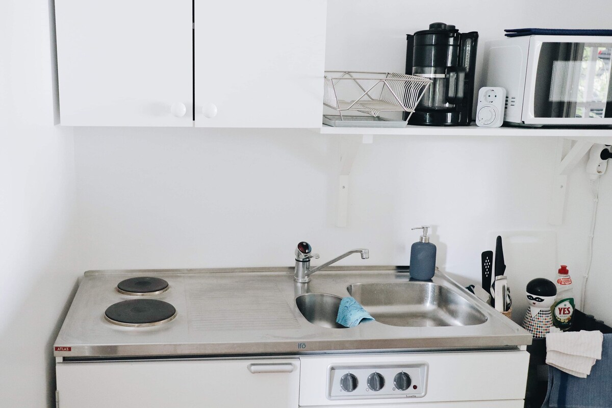 C'est littéralement comme vivre dans une boîte. La Beach Cabin est comme une chambre d'hôtel, avec un lit double pour deux personnes et un petit coin salon. Il y a également une kitchenette pour votre commodité, équipée des fournitures de cuisine nécessaires pour que vous puissiez préparer le petit déjeuner ou un repas pour deux. Le chalet est situé juste à côté de la plage de galets et de la mer. Les faibles sons des vagues vous feront dormir la nuit. La salle de bain est construite à côté de ce chalet à quelques pas seulement.