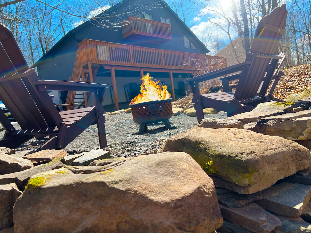 Renseignez-vous sur les offres spéciales de la semaine du printemps ! 🌸 Cette petite retraite spacieuse est entièrement approvisionnée pour des vacances en famille mémorables ou pour une escapade romantique en couple. Plongez dans votre spa privé, faites griller des guimauves au feu, balancez-vous dans le hamac sous les étoiles, ou restez à l'intérieur et profitez d'heures de jeu sur notre nouvelle Nintendo Wii. Profitez de l'accès à 2 plages, à une piscine olympique (saisonnière), à un minigolf, à des courts de tennis et plus encore. À quelques minutes des incontournables de Pocono comme le ski, les casinos et les parcs aquatiques.