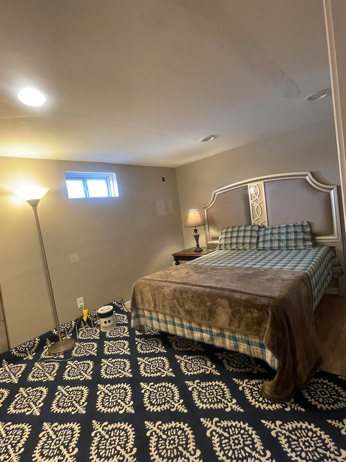 Appartement spacieux et lumineux d'une chambre, sous-sol/studio avec cuisine complète, coins salon et salle de bain avec buanderie complète. Parking sur place. Un niveau sans escalier. Emplacement résidentiel calme. Beaucoup de rangements le rendent parfait pour des séjours plus longs ! Nous sommes un couple de personnes âgées qui travaillent, sans animaux de compagnie pour le moment, vivant à l'étage. Parfois, nos petits-enfants nous rendent visite et peuvent passer la nuit.