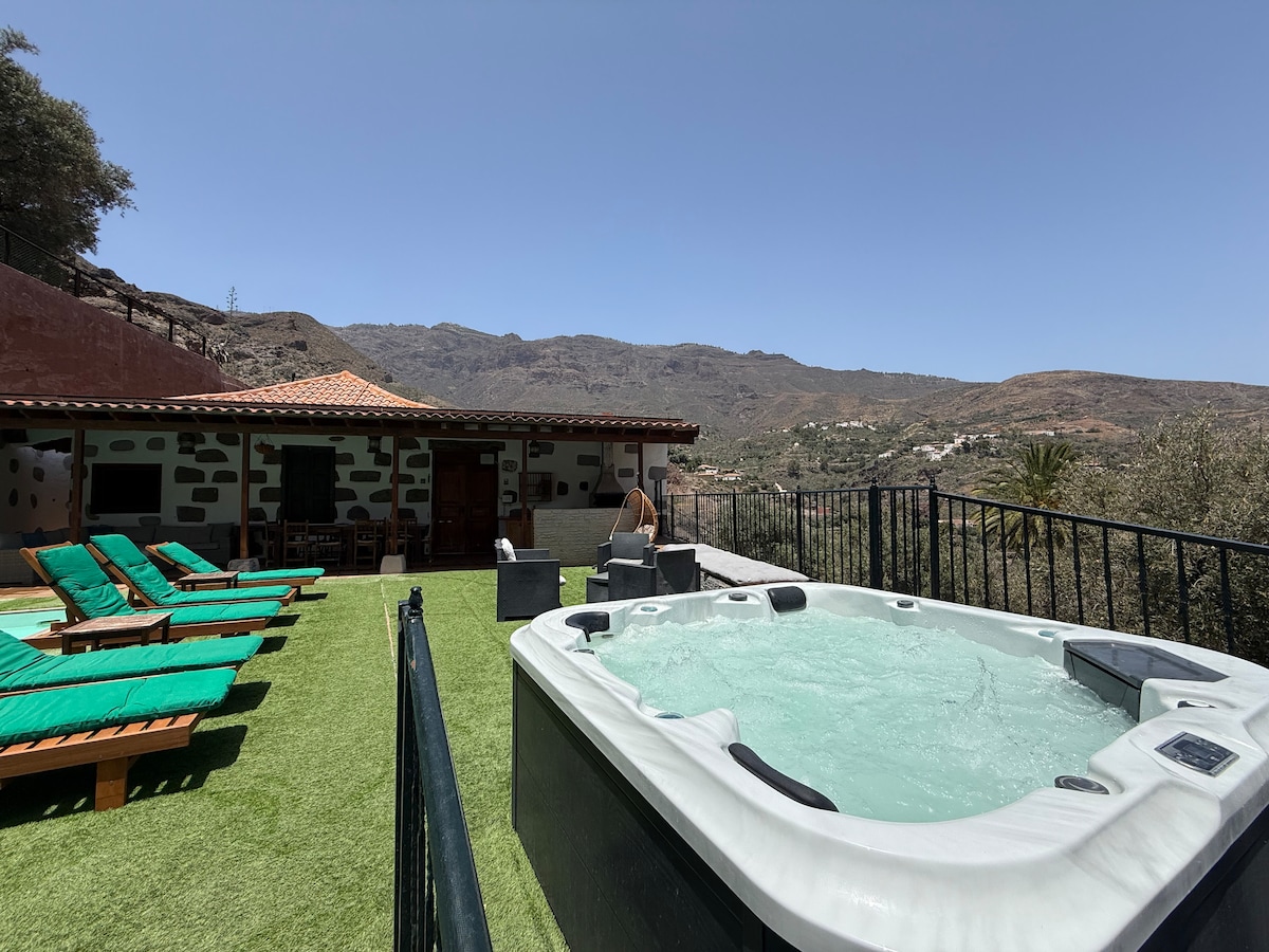 Situé sur le versant sud de l'île, dans la caldeira volcanique de Tirajana, un endroit idyllique. La vue s'ouvre à 360 ° sur les palmeraies de la vallée et les sommets volcaniques. Elle dispose d'une piscine avec cascade, chauffée et traitée au sel. Elle est située dans une ferme à côté d'une autre maison de vacances pour deux personnes. Les deux maisons sont complètement indépendantes et ont leurs propres accès et services, le parking et la piscine étant les seuls espaces partagés. Par conséquent, l'intimité est garantie.