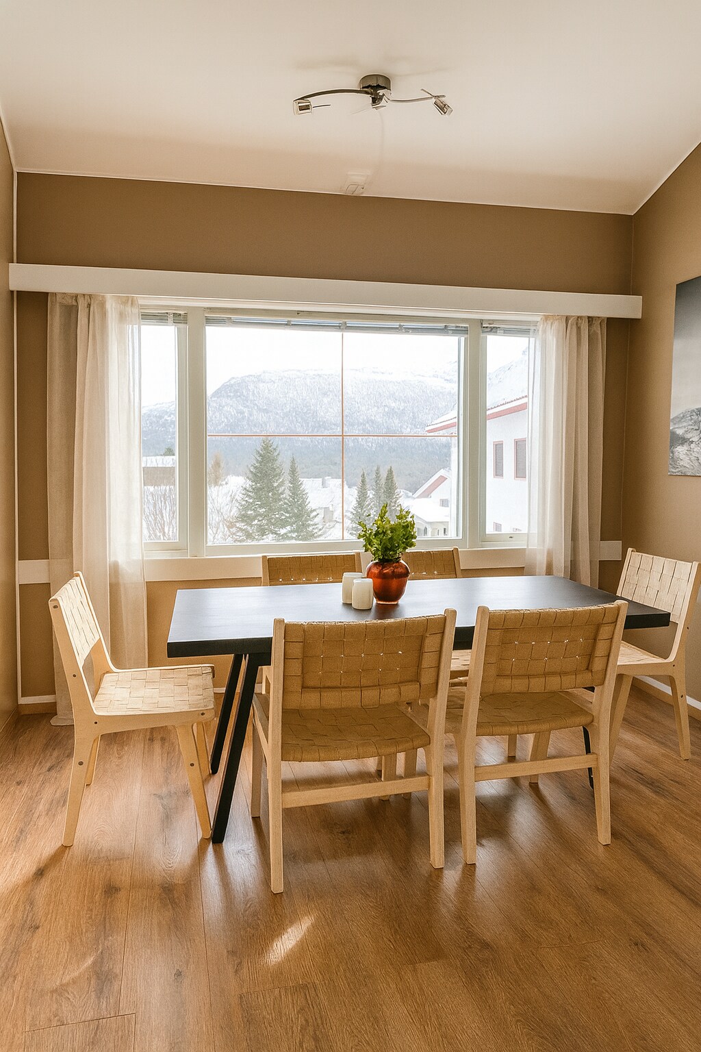 Appartement récemment rénové dans un immeuble plus ancien dans un environnement fantastique. Chemin court à Åmotan avec 3 chutes d'eau, de bonnes opportunités pour des excursions à proximité. Bon point de départ pour la réponse de Nordmøre à la chaire, Ekkertind. L'appartement est d'environ 40 m2, la hauteur du plafond dans les chambres est basse, environ 175-180 cm. La chambre dispose de deux lits, 150 cm et 120cm respectivement. Il y a une chambre pour 2 adultes et 2 enfants, mais nous recommandons max 3 personnes Le locataire apporte sa propre literie. Le linge de lit peut être loué pour 120 NOK par personne.