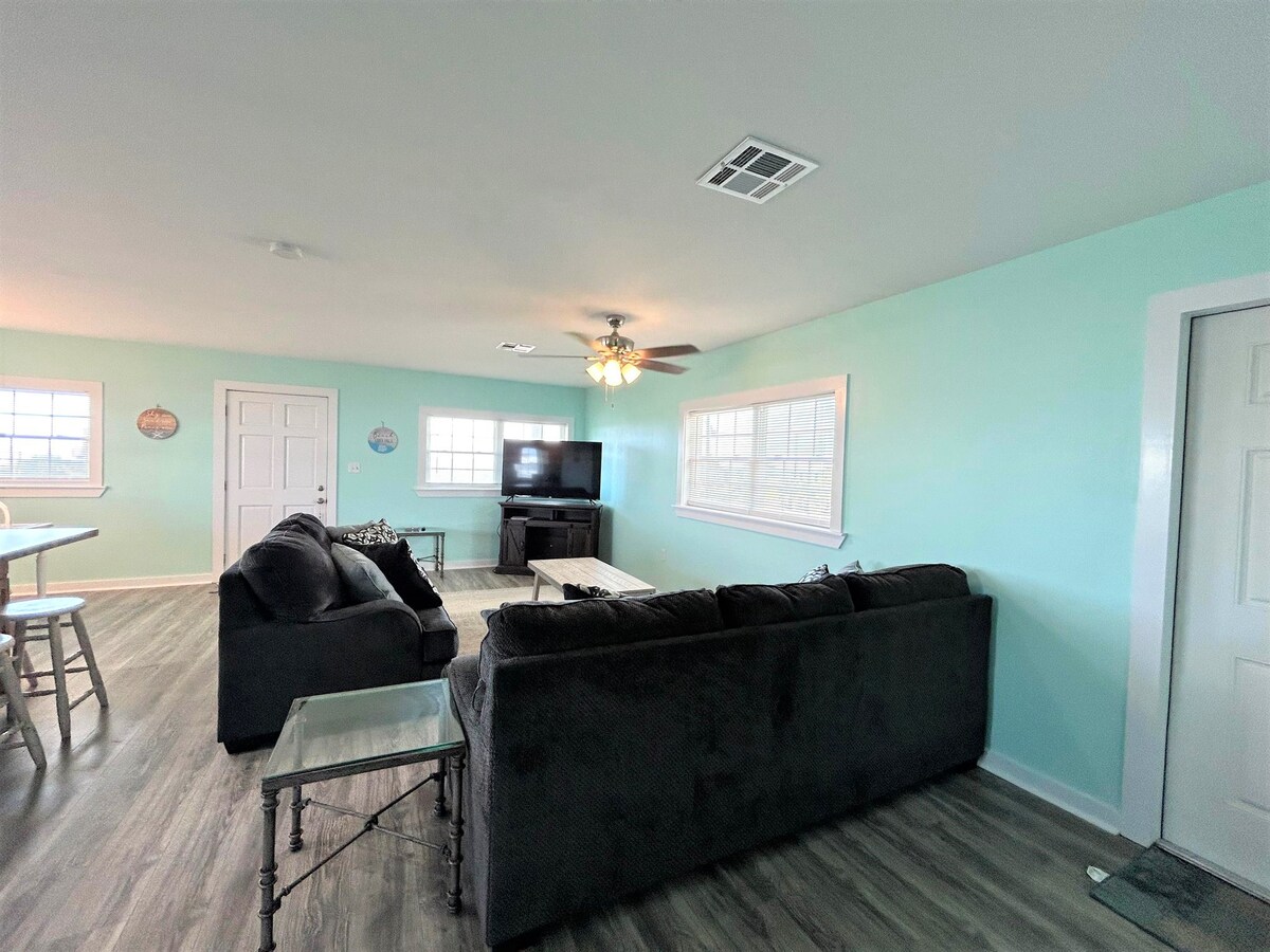 Quite island get away- This camp has 3 bedrooms (2 queens bedrooms, queen pull out sofa bed and 1 bunk bedroom with 2 sets of twin bunks) and 2 baths (‘plus outdoor shower) Located 1 block from Hwy 1 on the east side of the island at beach crossover 2.1 -it’s a enjoyable short walk to the beach or you can rent a golf cart and enjoy cruising the beach. There is plenty of room under camp for seafood boils and swinging on swings with your family and friends after your fun day spent at the beach.