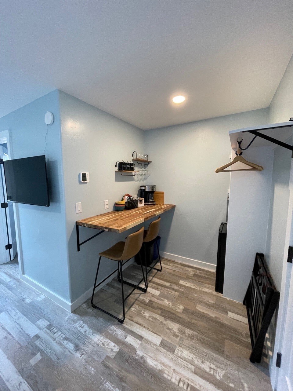 Cette suite élégamment aménagée offre une retraite confortable mais sophistiquée, avec un lit queen confortable et une salle de bain moderne avec tous les équipements. La kitchenette compacte comprend un réfrigérateur et un micro-ondes, parfaits pour la préparation et le rangement des repas. Dégustez une tasse fraîchement infusée avec la théière et la cafetière dans la chambre, et gardez les produits de base en sécurité dans un coffre-fort. Détendez-vous avec vos services de streaming préférés sur la télévision à écran plat et profitez d'un séjour raffiné et confortable dans un cadre intimiste.