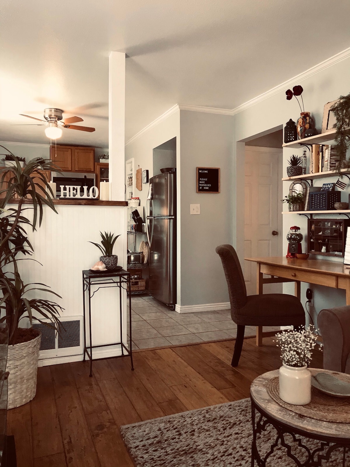 Cette maison de 1914 magnifiquement rénovée se trouve à deux pâtés de maisons des boutiques, théâtres, restaurants et événements de Whiskey Row et Downtown Prescott. Maison accueillante conçue par des professionnels, deux chambres avec chacune un lit Queen Size, deux magnifiques salles de bains avec chacune une douche complète et une baignoire, et une troisième chambre privée avec deux lits jumeaux. Le séjour dispose d'un grand mur d'accent, d'un mobilier riche et d'un poêle à gaz chaleureux pour des soirées réparatrices à la maison. Bienvenue à Prescott et bienvenue chez nous.