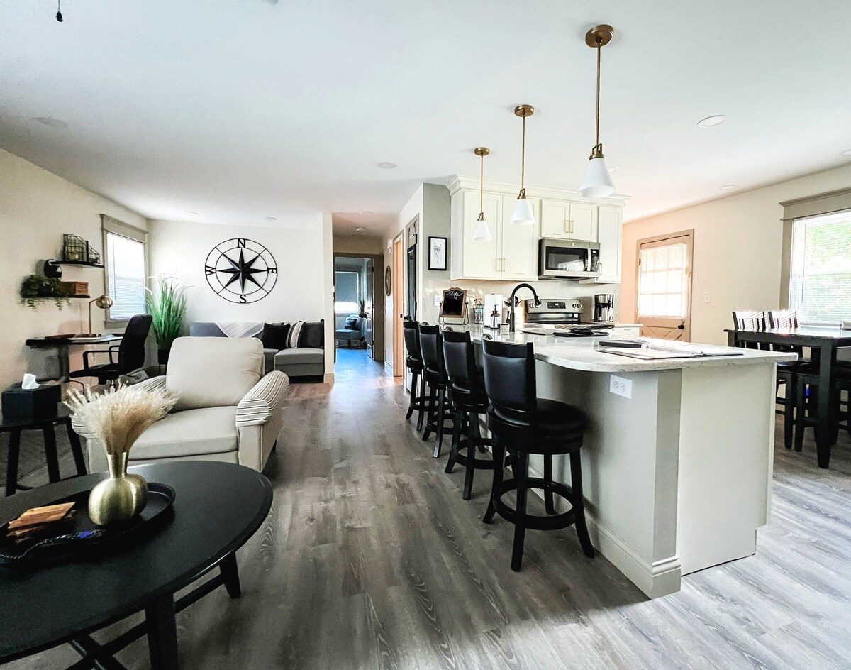 Près de l'enceinte de l'arche. 14 acres. La chambre familiale est indiquée comme chambre, mais il s'agit d'un canapé-lit queen et de 3 salles de bain. Capacité de 10 personnes. Cuisine entièrement équipée. Prenez votre café sur la terrasse arrière. Un cadre champêtre paisible, mais toujours à proximité de tous les magasins et de l'ARCHE. Nous avons eu beaucoup de bébés et de tout-petits qui ont séjourné à l'aire de repos Noah. Nous offrons un lit pour bébé portatif et une baignoire pour bébé. Retraite familiale paisible✌️
