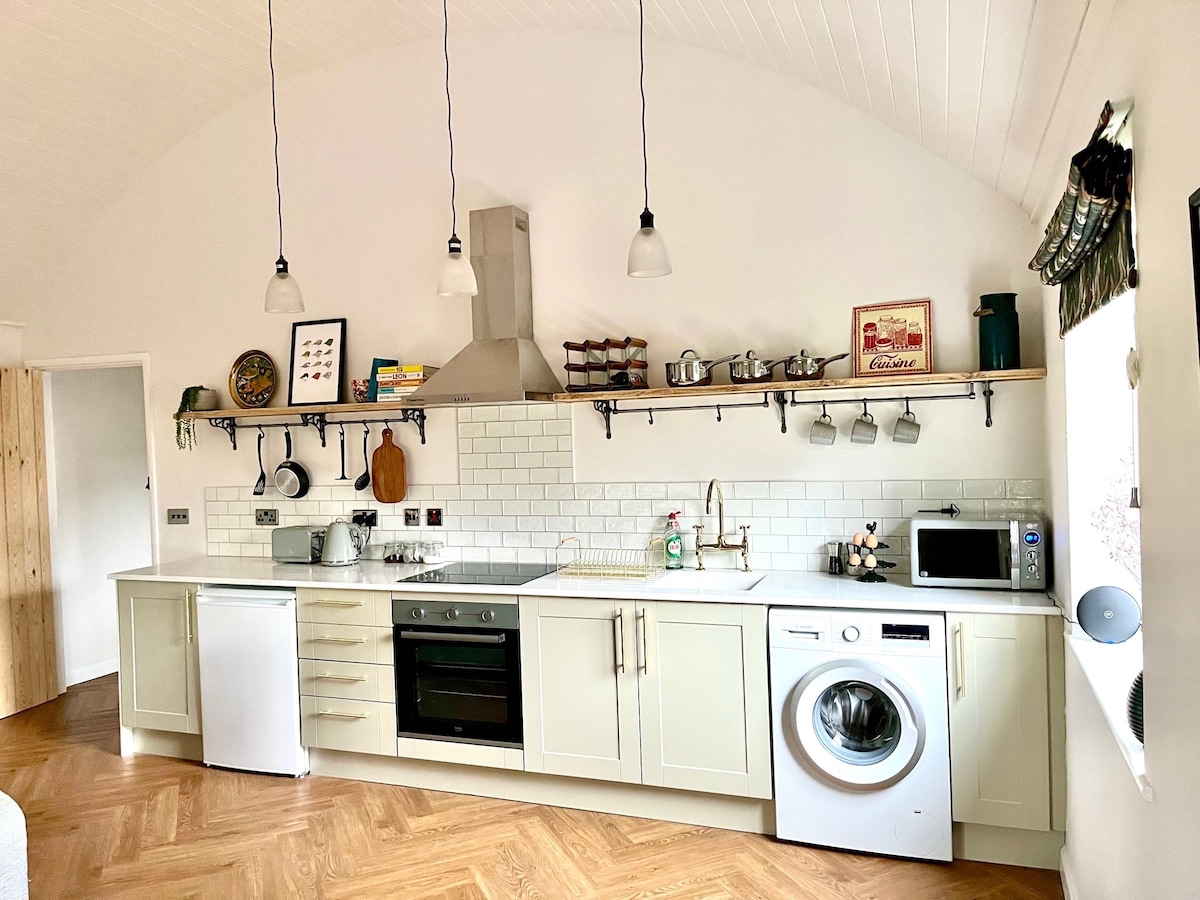 Cette remise du 19e siècle rénovée par des experts est pleine de caractère et prête pour votre escapade de luxe relaxante. Le salon ouvert offre une vue exceptionnelle, et lorsque vous voulez un changement, il y a une grande télévision connectée et une connexion haut débit de bonne qualité pour le divertissement. La cuisine est équipée d'une plaque à induction et d'un four, d'un lave-vaisselle et d'un lave-linge, ainsi que de toutes les casseroles, poêles et ustensiles dont vous avez besoin pour cuisiner de délicieux repas. La salle d'eau/WC est idéalement nichée dans un coin. Montez l'escalier en chêne distinctif pour trouver la chambre à l'étage, avec son impressionnante fenêtre ronde. Elle peut accueillir jusqu'à trois personnes dans un lit double king size et un lit simple séparé, et il y a également de la place pour un lit de voyage pour un bébé. La maison de charrette est idéale pour un couple en escapade romantique, ou pour une famille avec de jeunes enfants à la recherche d'un espace sûr pour se détendre et jouer. CARACTÉRISTIQUES PRINCIPALES - Une chambre à l'étage, avec lit double king size et lit simple, espace pour lit bébé. - Une salle d'eau/WC – en bas. - Jusqu'à trois personnes et un bébé peuvent y être hébergés. - Terrasse extérieure privée avec vue, utilisation partagée de 1,5 acre de prairie et de jardins sécurisés. - Chiens bienvenus, deux maximum, petit supplément. - Jeunes enfants bienvenus (mais vous devrez peut-être apporter une barrière d'escalier pour plus de sécurité). - Télévision connectée (Netflix, iPlayer, Freesat, etc.) ; - Haut débit de bonne qualité/Wi-Fi (gratuit) ; - Plaque à induction, four, micro-ondes, réfrigérateur (congélateur disponible si nécessaire), lave-vaisselle. - Table à manger pour quatre personnes, deux canapés en cuir. - Lave-linge (et utilisation du sèche-linge si nécessaire) ; - Chauffage au sol (alimenté par des pompes à chaleur à air écologiques) ; - Poêle à bois, premier panier de bûches gratuit. Le Coach House est réservable à la semaine (jour de début le vendredi) et pour les courts séjours en fin de semaine et en milieu de semaine.