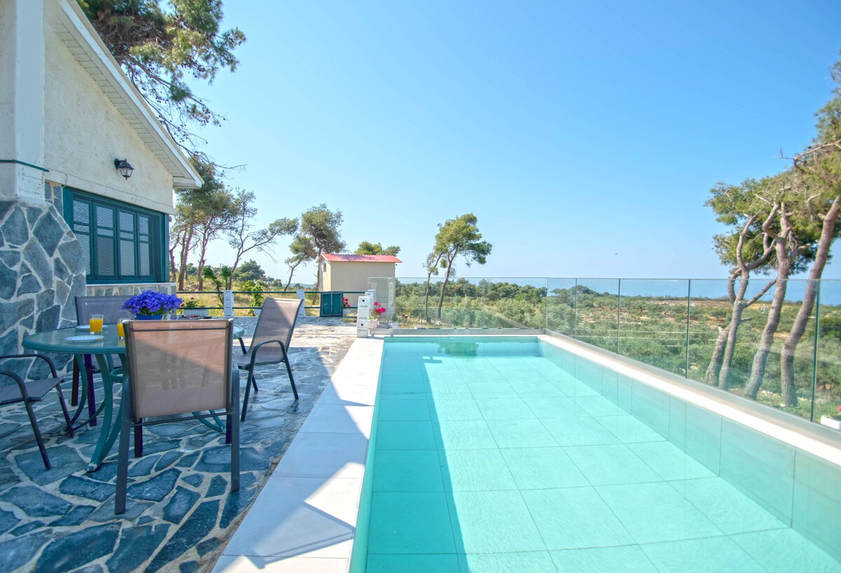 La Villa Versailles est construite en pierre et comprend un espace fonctionnellement indépendant qui occupe une superficie de 77 m2 et plus de 120 m2 de deux terrasses. La villa dispose d'immenses espaces extérieurs privés sur un terrain de 4 hectares (40 000m2), une vue imprenable sur la mer Égée bleu scintillant, dans un emplacement unique et calme, la partie la plus verdoyante de l'île, parsemée de vieux chênes rares classés ''Natura 2000''. Peut accueillir 4 personnes. Les merveilleuses plages sont à seulement trois km.