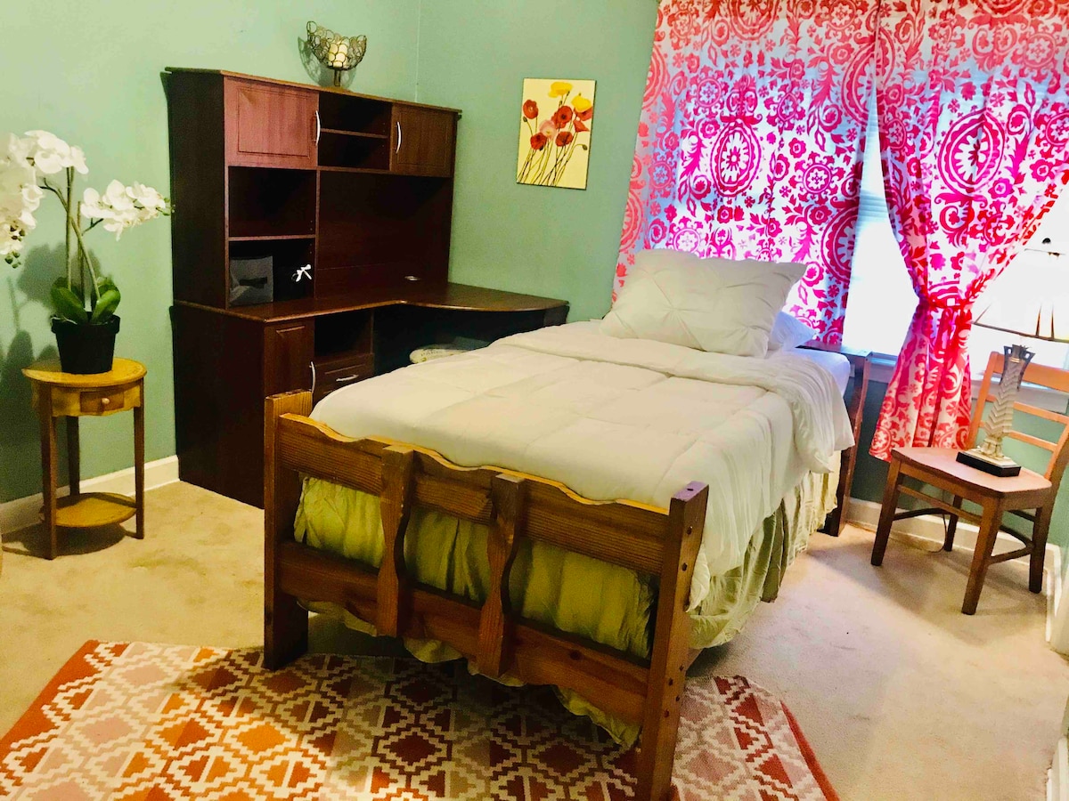 2 chambres SÉPARÉES/1 salle de bain partagée. Peut accueillir 3 personnes. Une chambre a un lit confortable en mousse à mémoire de forme Twin, 1 salle de bain complète Roku TV. Dans l'autre chambre Un lit Queen Size de rêve, une décoration chic/vintage, une atmosphère relaxante, un éclairage calme, avec une télévision/Roku/Netflix/Hulu et plus de chaînes! Modeste/confortable/propre. Pas toujours aussi calme, les voyageurs et nous-mêmes ont différents horaires. Bkfst continental, bevs et snacks pour vous ! Réfrigérateur/garde-manger 4u dans la cuisine. pas DE CUISSON. pas DE CUISSON.