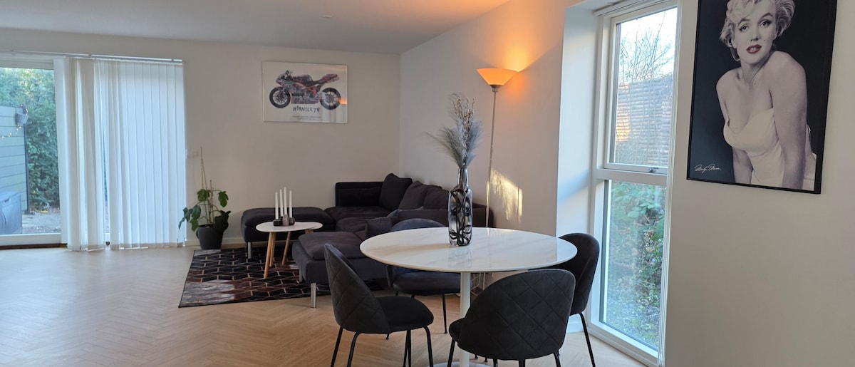 Délicieuse nouvelle villa moderne avec beaucoup d'espace pour les enfants. 4 chambres pour enfants Un grand espace extérieur avec trampoline, des balançoires fraîches et un grand toboggan. Le poulailler adapté aux enfants et la possibilité de ramasser les œufs le matin. Les poules sont apprivoisées et les enfants peuvent les tenir. Super canapé salon à l'extérieur ainsi que deux salles à manger extérieures. Sauna, spa et piscine d'eau froide. Serre. Belle grande cuisine commune avec 4 sièges à la table de la cuisine et 12 sièges à la table à manger. À 3,3 km de la plage et du train S et à 700 m de Rema.