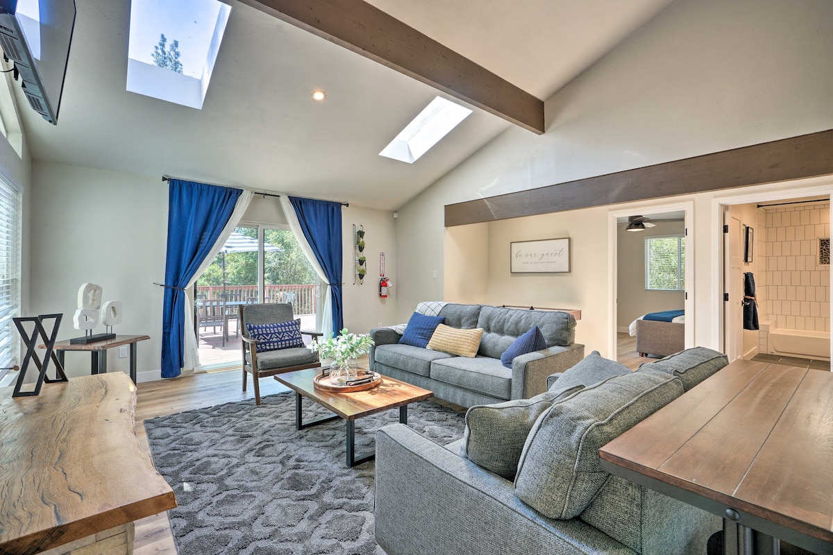 C'est une jolie maison d'hôtes au deuxième étage. Elle est très privée, située sur notre vignoble/ranch de plus de 83 acres. Nous avons un vignoble de 6 acres en activité et cultivons commercialement du Zinfandel, du Petite Sirah et du Muscat Canelli. La maison d'hôtes a récemment été rénovée et est lumineuse, aérée avec de nombreuses caractéristiques et équipements haut de gamme. C'est un cadre très privé sans voisins immédiats. Il y a environ 140 établissements vinicoles dans un rayon de 25 miles de notre logement.