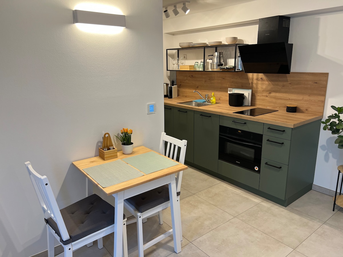 Notre appartement de vacances en sous-sol, aménagé avec amour, peut accueillir deux personnes. Une grande chambre avec un lit boxspring, une salle de bains moderne et une cuisine entièrement équipée vous attendent. Si le temps le permet, vous pourrez vous détendre dehors sur la terrasse. L'appartement de vacances est situé au sous-sol de notre maison individuelle habitée. Nous vivons ici en famille avec des enfants. En seulement 5 minutes, vous êtes dans la nature – parfait pour les promenades, même avec un chien. Nous vous attendons avec impatience !