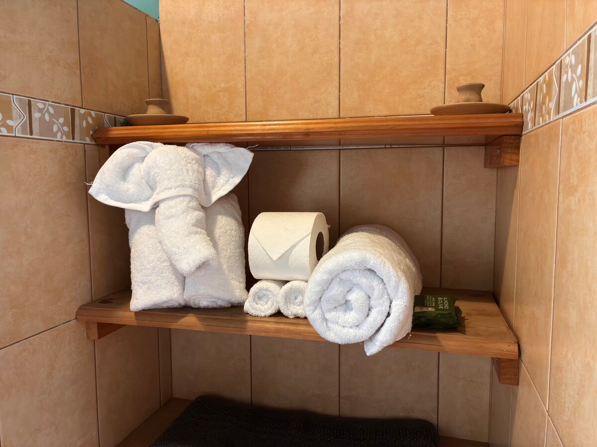 Welcome to our Spacious Room, where tranquility and comfort await. You'll find a luxurious king-size bed and gleaming hardwood floors, creating a serene atmosphere for relaxation. Step onto the terrace, where a peaceful sitting area invites you to unwind. The room boasts a high ceiling, and the modern bathroom features a cast iron bathtub, perfect for those who appreciate a soothing soak. The space is adorned with original artwork and handcrafted furniture, adding to its charm.