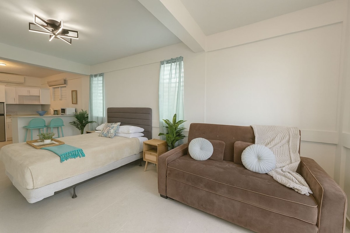 Bienvenue dans notre charmant studio en bord de mer ! Cet espace confortable est parfait pour les couples ou les voyageurs en solo qui recherchent une escapade relaxante et confortable. Dès que vous entrez, vous serez accueilli avec un lit queen size confortable et une cuisine entièrement équipée avec une table de cuisson (pas de four) pour que vous puissiez créer de délicieux repas. Le studio dispose également de la climatisation qui refroidit l'ensemble du logement, vous assurant de rester au frais et à l'aise pendant votre séjour.